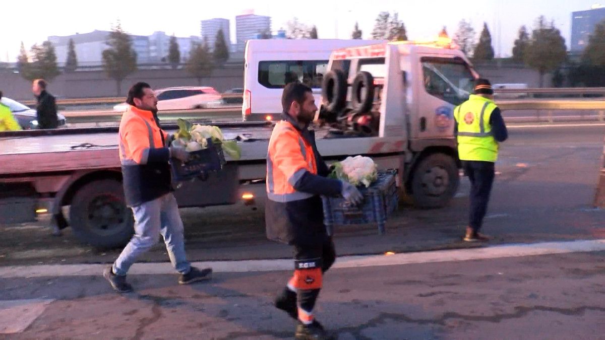 Yola saçılan sebzeler görevliler tarafından temizlenirken yan yatan kamyonette sağlam kalan sebzeler de başka bir araca taşındı.