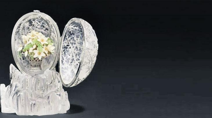 1913’te II. Nikolay’ın annesi Maria Feodorovna için hazırlanan ve Alma Pihl tarafından tasarlanan eser, kaya kristali, platin ve pırlanta detaylarıyla dikkat çekiyor.