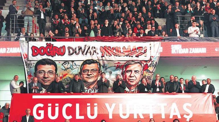 ■ Kurultayın seyircili yapılan ikinci gününe, salona asılan, üzerinde “Doğru duvar yıkılmaz” yazan ve Özel’in iki yanında, ABB Başkanı Mansur Yavaş ile Ekrem İmamoğlu’nun resmedildiği dev graffiti pankart dikkati çekti.