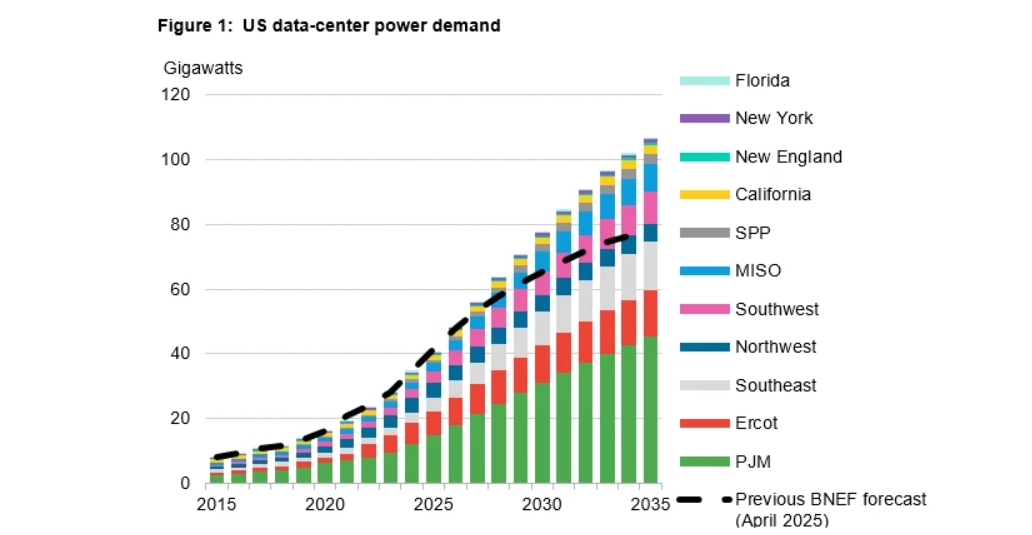 Yeni bir rapor, küresel ölçekte hızla artan veri merkezi inşaatlarının önümüzdeki on yılda ABD’de enerji talebini dramatik biçimde yukarı çekeceğini ortaya koyuyor. BloombergNEF tarafından yayımlanan analiz, 2035’e gelindiğinde veri merkezlerinin toplam 106 GW elektrik çekeceğini, bunun da günümüzdeki 40 GW seviyesinin yaklaşık 2,7 katı olduğunu belirtiyor. Veri merkezlerinde frenleme yok